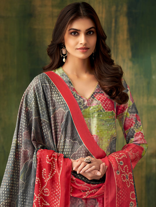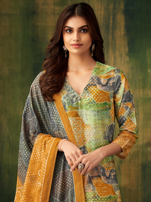 MAYSA Metallic Mehendi - Muslin Suit Set With Fancy Handwork