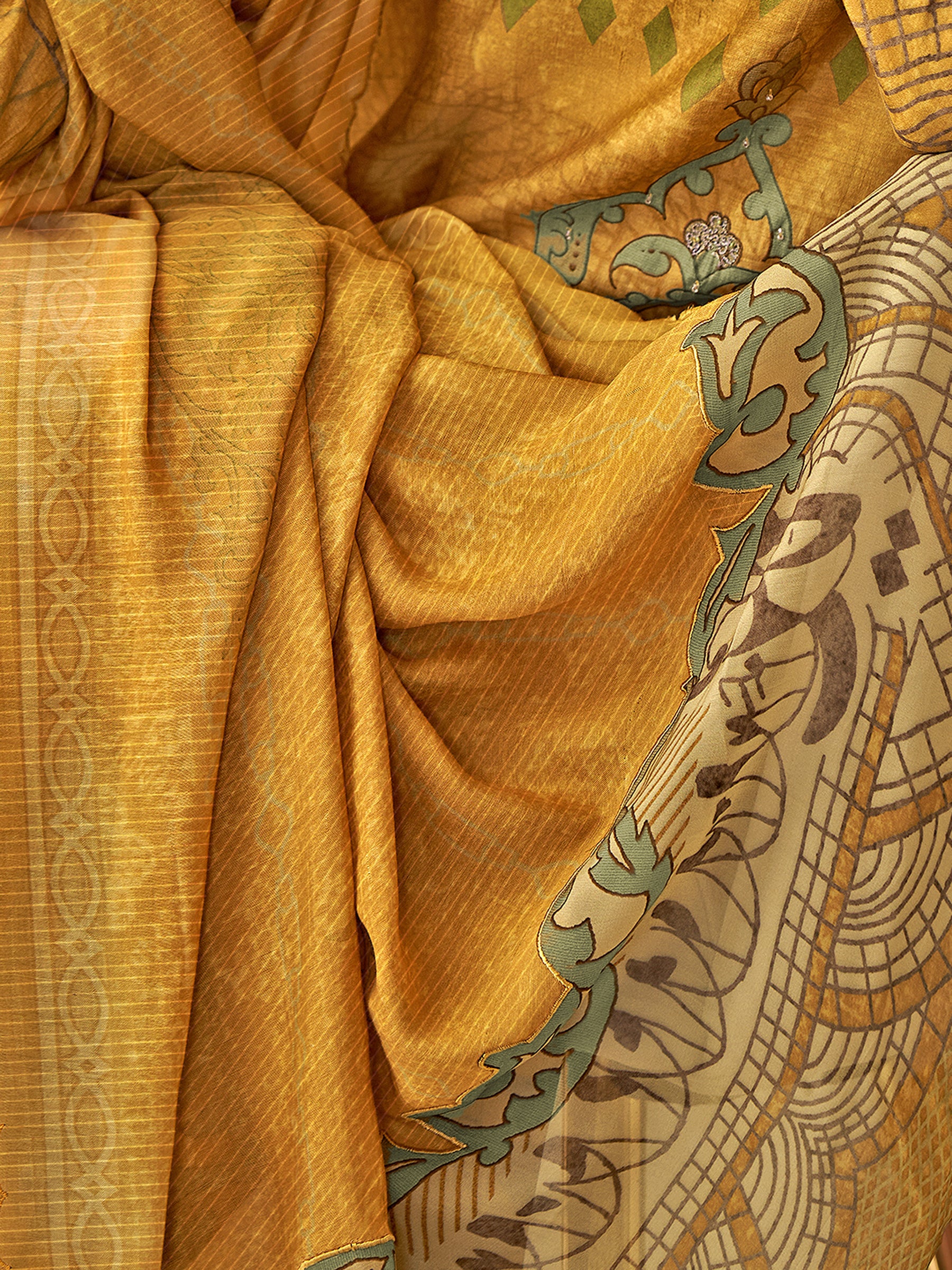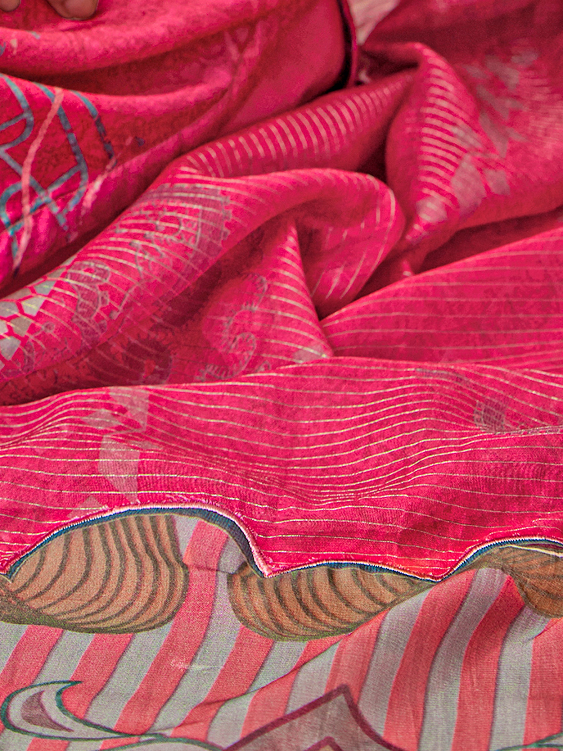 Top:-Pure Muslin Silk ; Bottom:-Mulberry Satin; Dupatta:-Muslin Jari Lining Digital Print; Arka Embroidery, Threadle & Patch Work; Handwork Details; Top with attractive Handwork;
