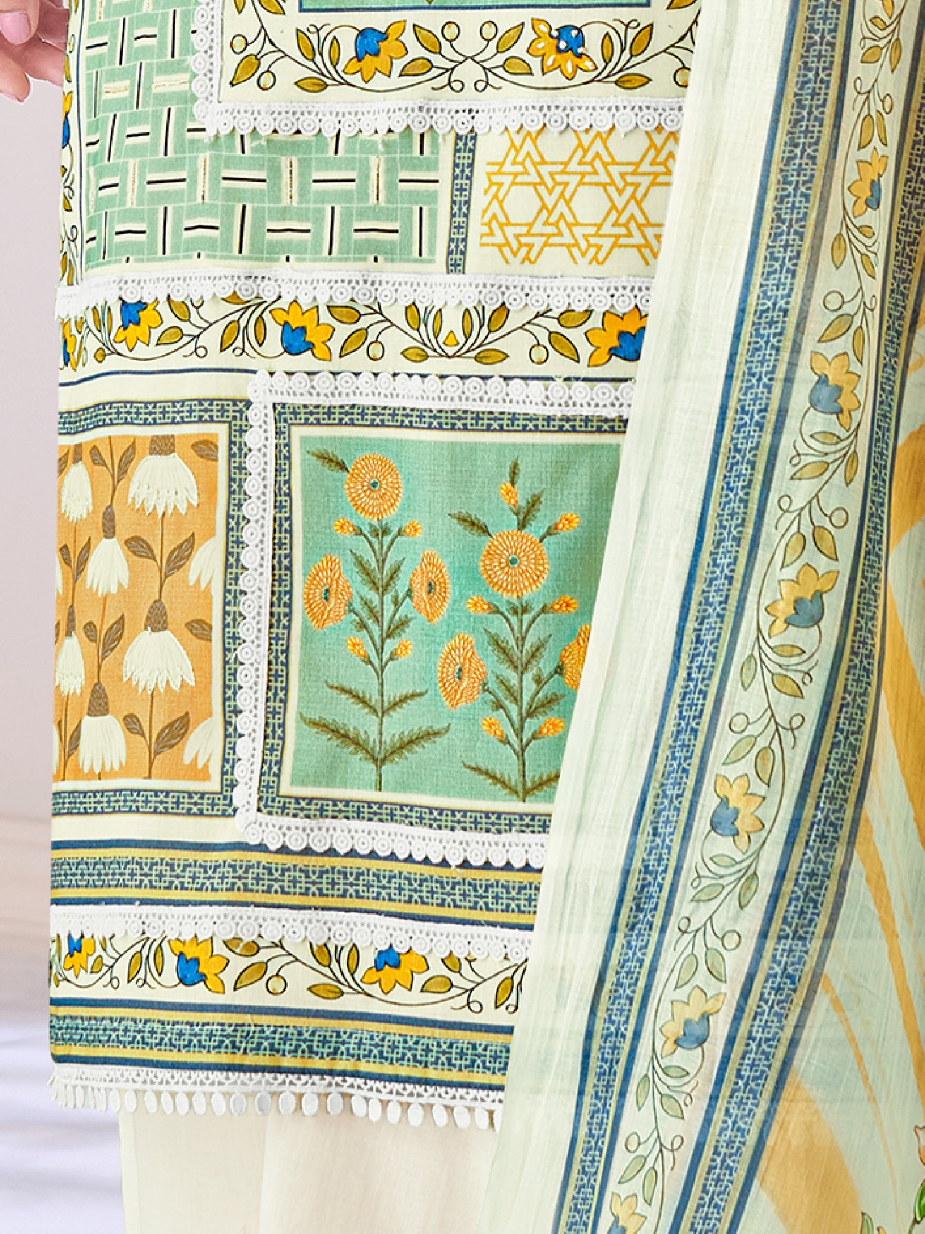 Top:-Pure Cotton; Bottom:-Pure Cotton; Dupatta:-Pure Bemberg Digital Print; Handwork details; Top with attractive Handwork & Sleeve Embroidery;