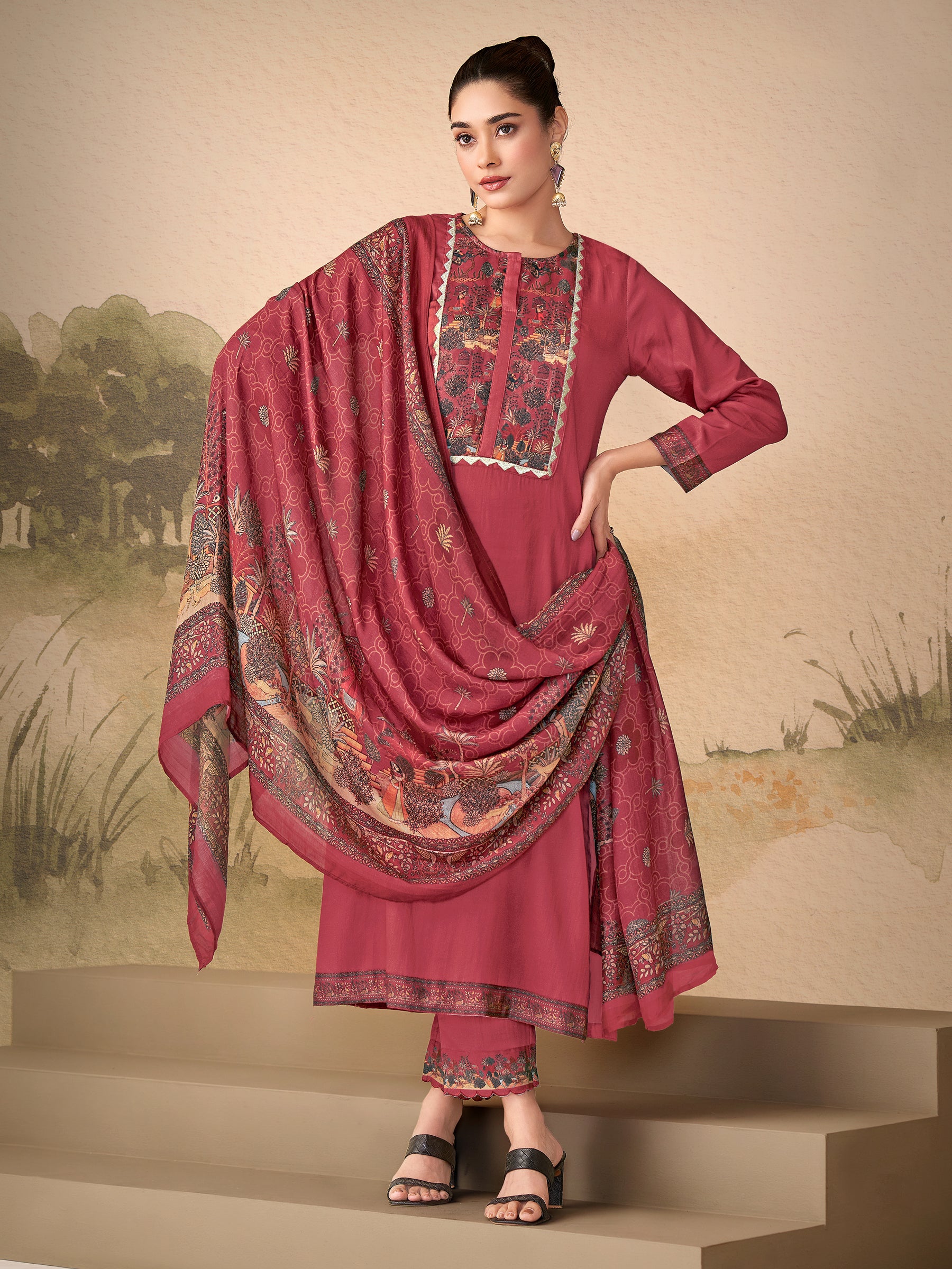 Top:-Pure Cosmos Satin Dyed With Mal Inner; Bottom:-Pure Cosmos Satin Solid Dyed Plazzo With Digital Print Patta & Embroidery Arka; Dupatta:-Pure Muslin Silk Digital Print ; Handwork Details; Top with attractive Digital Print Neck Handwork With Embroidery Patti & Daman and Sleeve Digital Print Patta ;