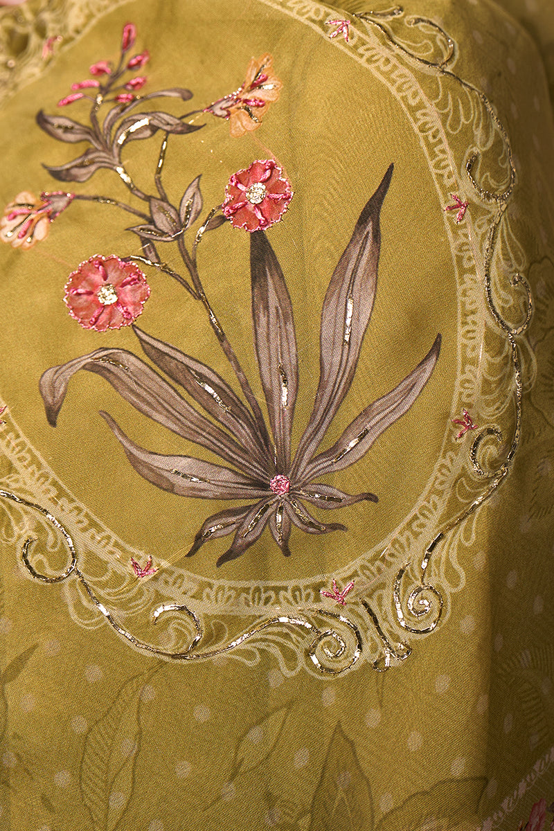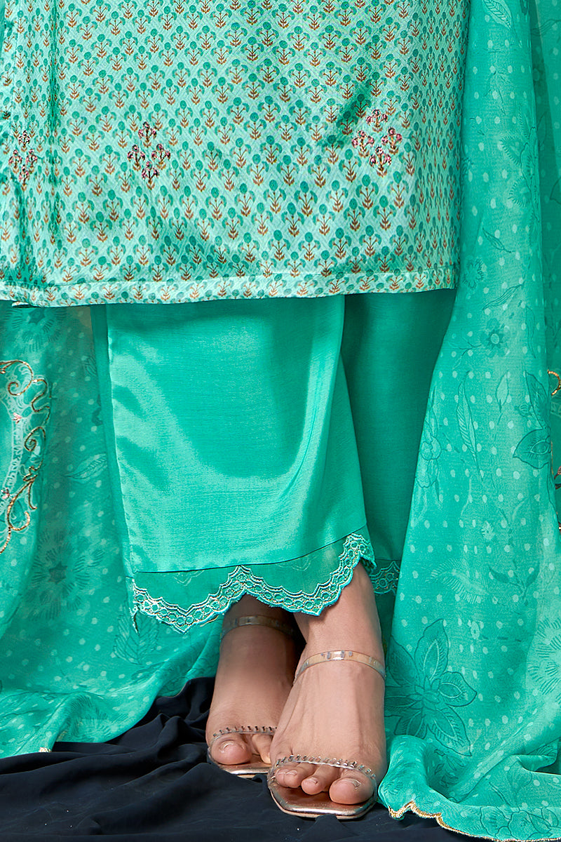 Top:-Pure Habutai Silk With Mal Inner; Dupatta:-Pure Orgenza Silk Digital Print With Embroidery; Arka & Handwork ; Bottom:-Heavy Muslin Silk Solid Dyed With; Silk Embroidery Plazzo; Handwork Details; Top with attractive Handwork & Silk Embroidery Neck Patti;