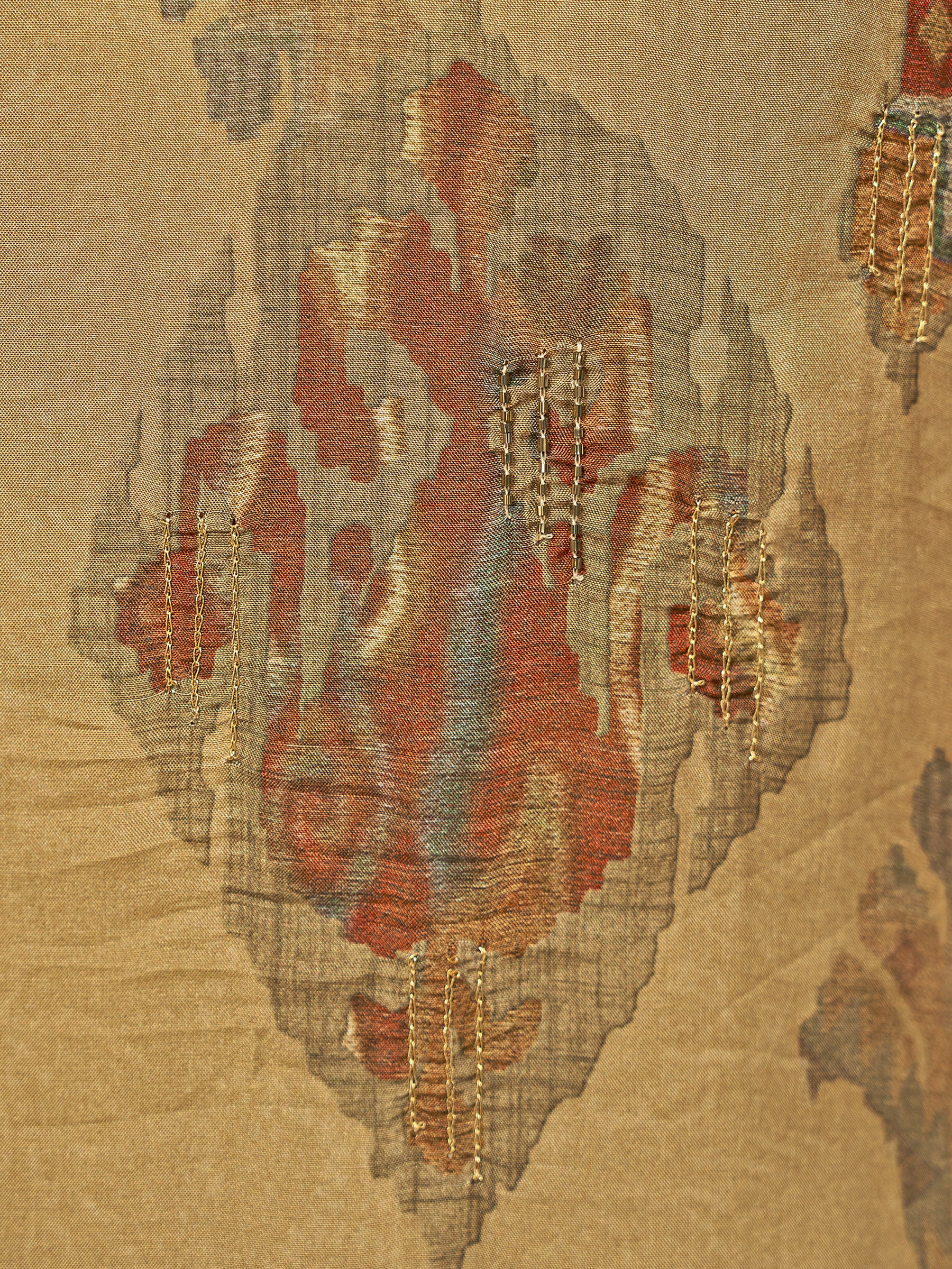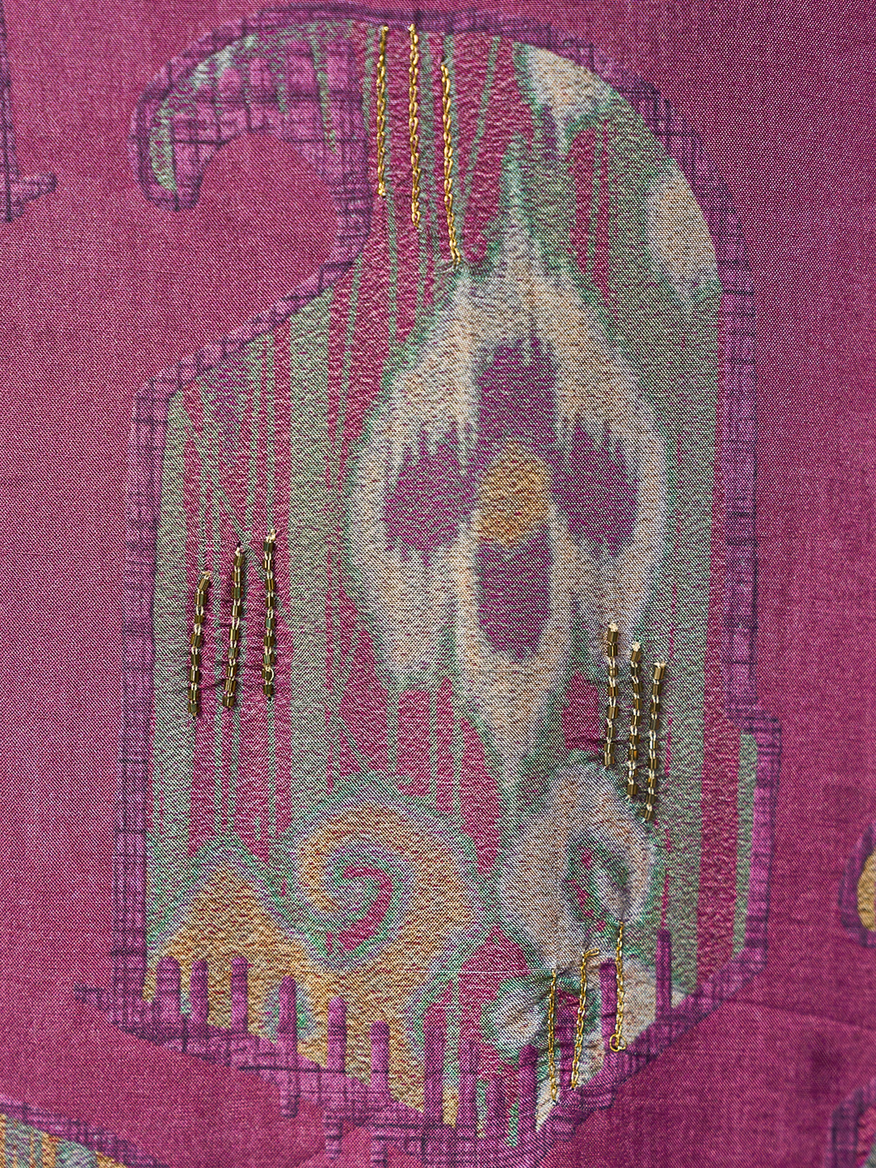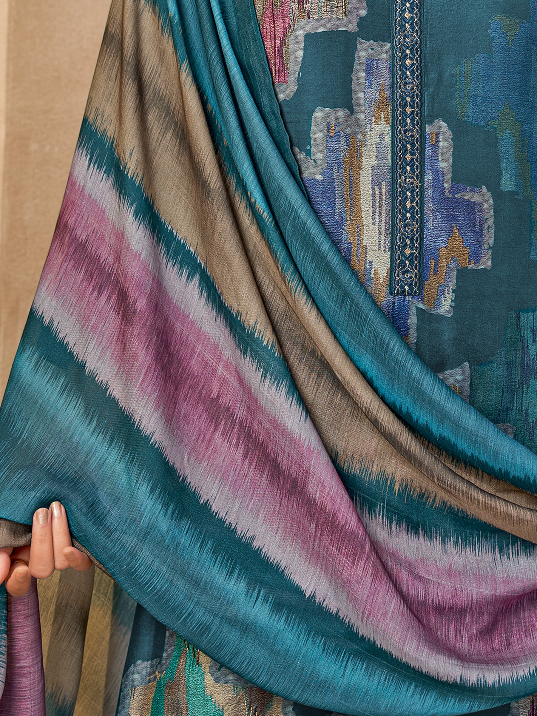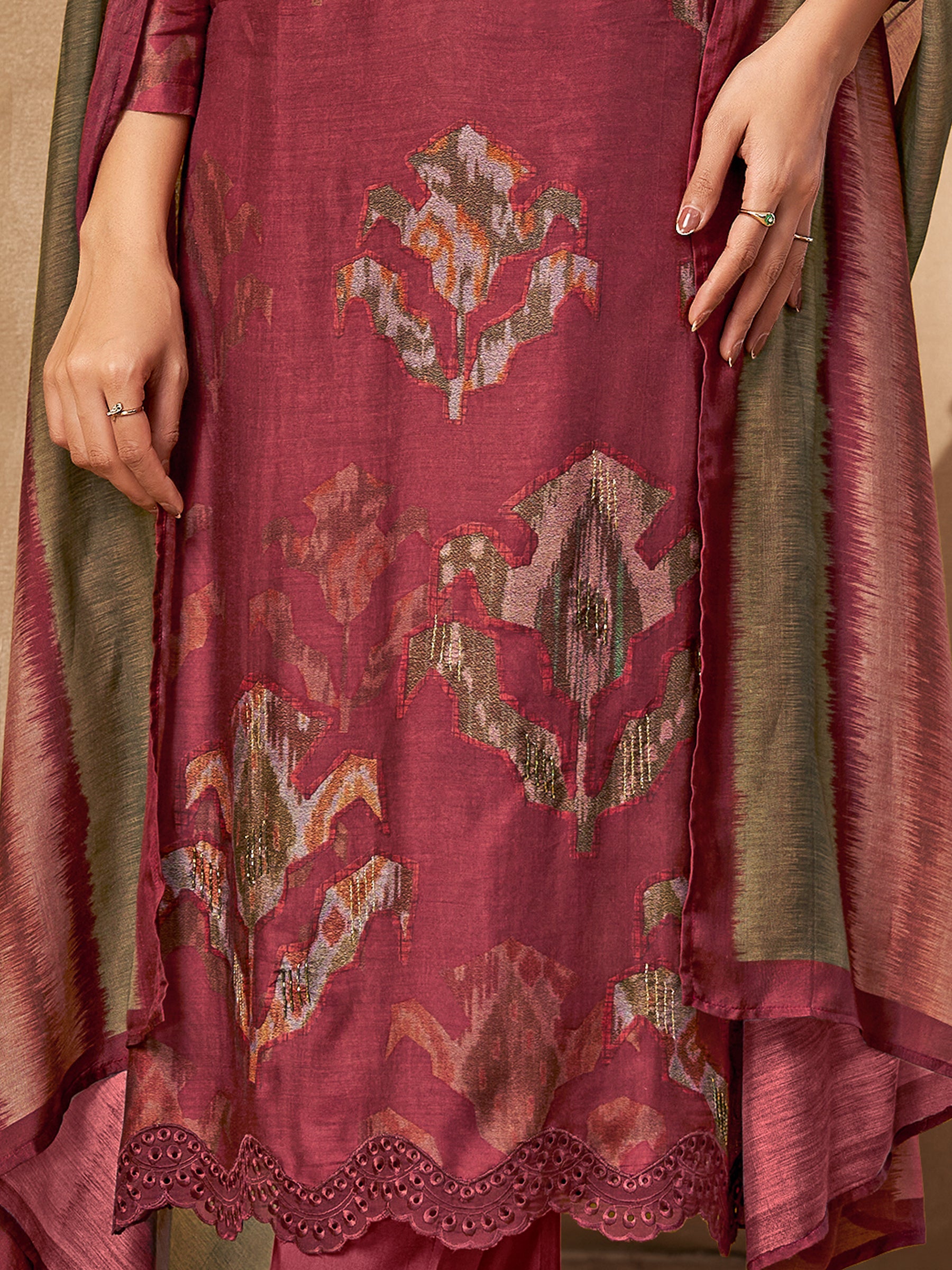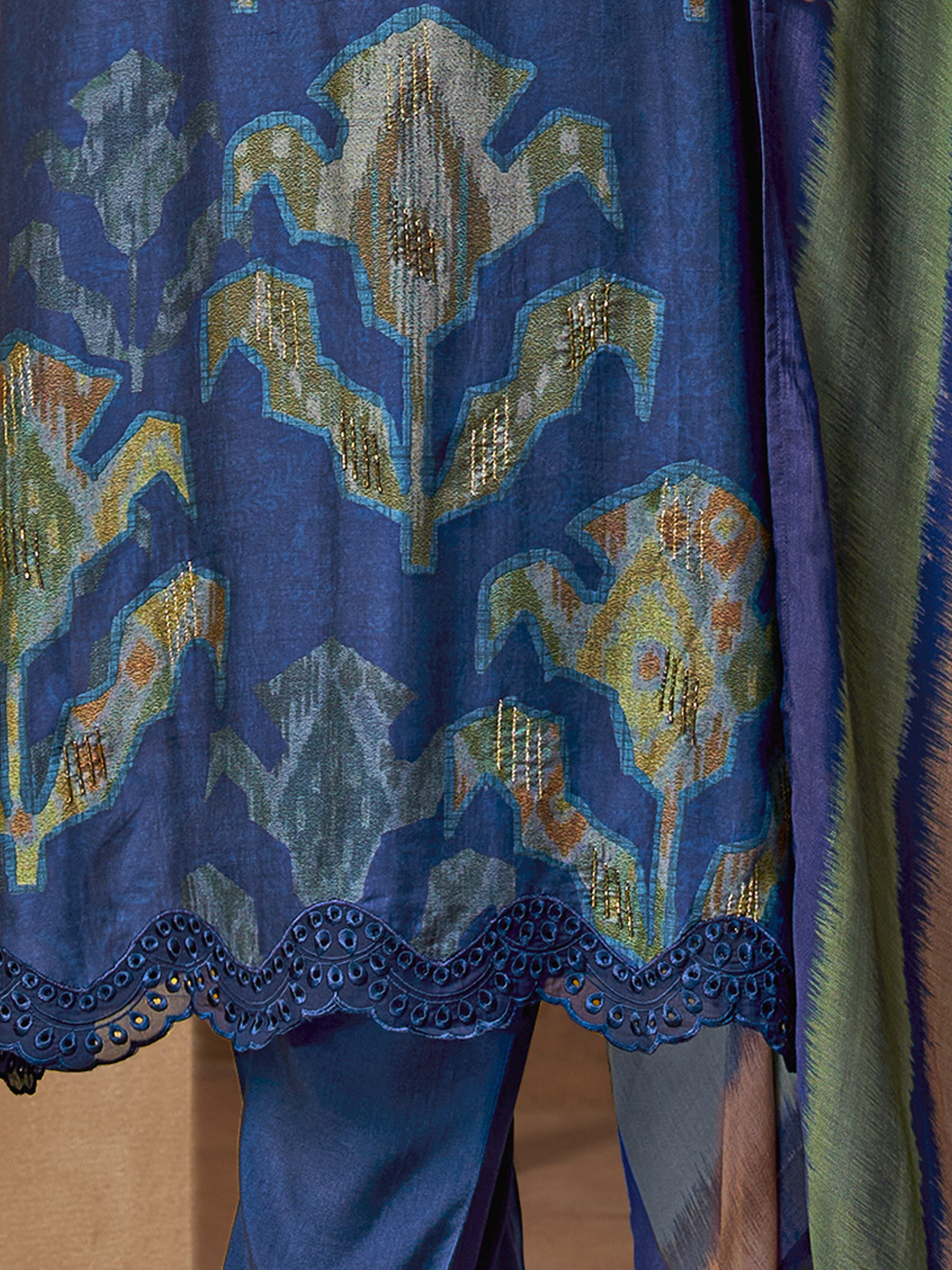 Top:-Pure Muslin Silk; Bottom:-Pure Mulberry Satin With Embroidery Plazzo; Dupatta:-Pure Silk Fancy Stripe Digital Print; Handwork Details; Top with attractive Embroidery Daman Tredal Patch & Silk Embroidery Plaket Handwork;