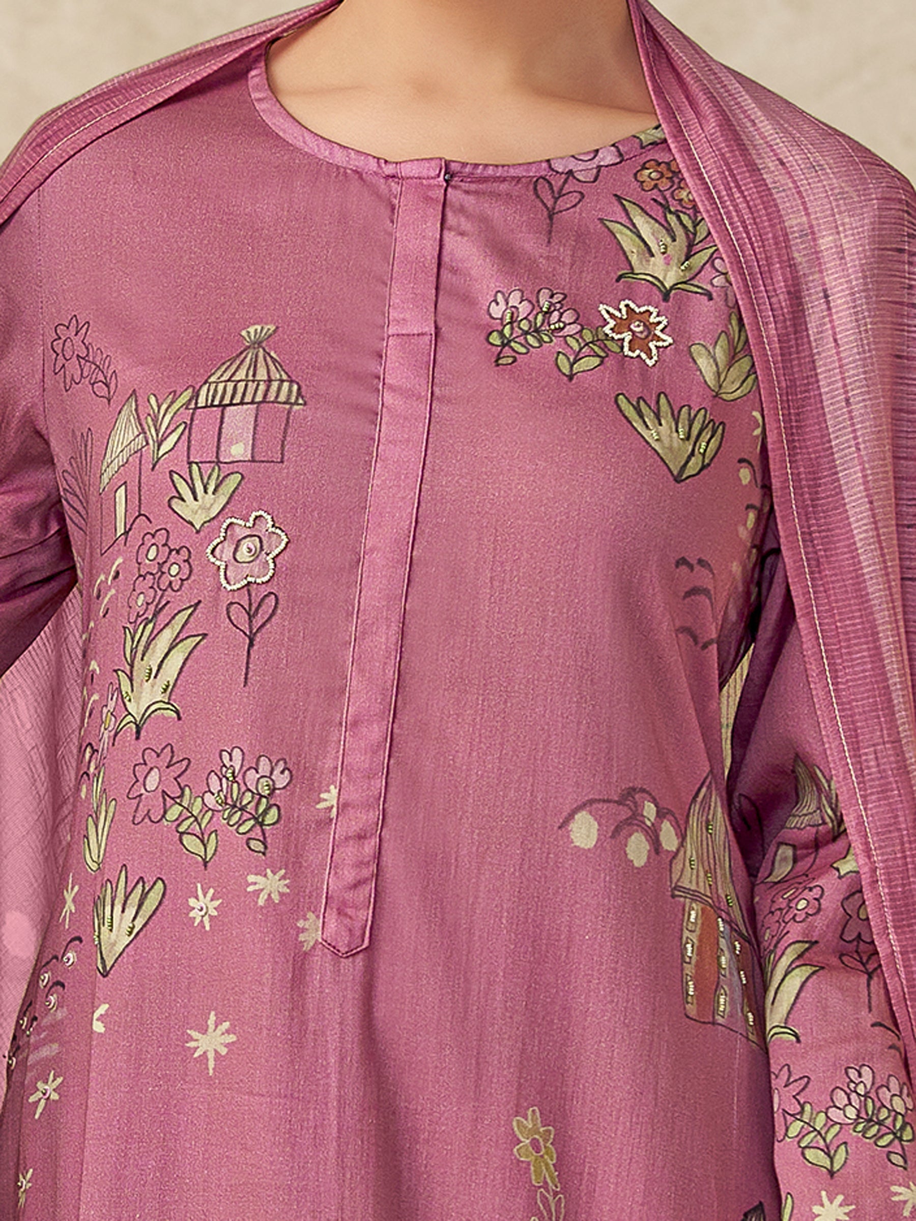 Top:-Pure Italian Satin Lawn; Bottom:-Italian Satin; Dupatta:-Fancy Jari Lining Digital Print; Handwork Details; Top with attractive Handwork;