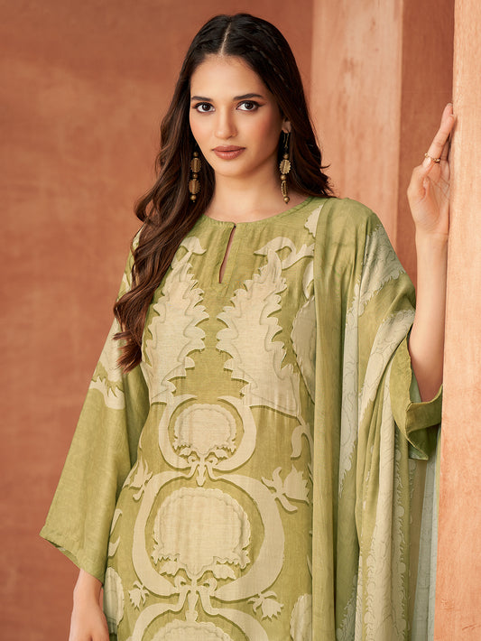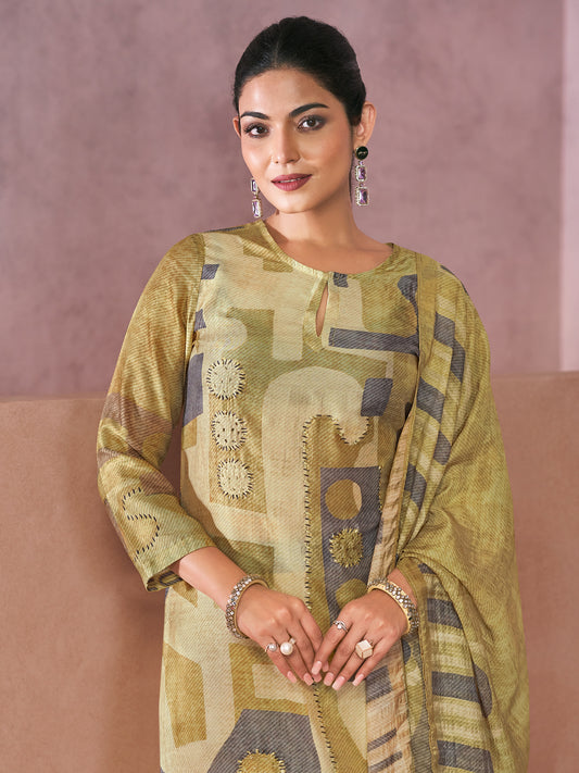 MAYSA Metallic Mehendi - Muslin Suit Set With Fancy Handwork